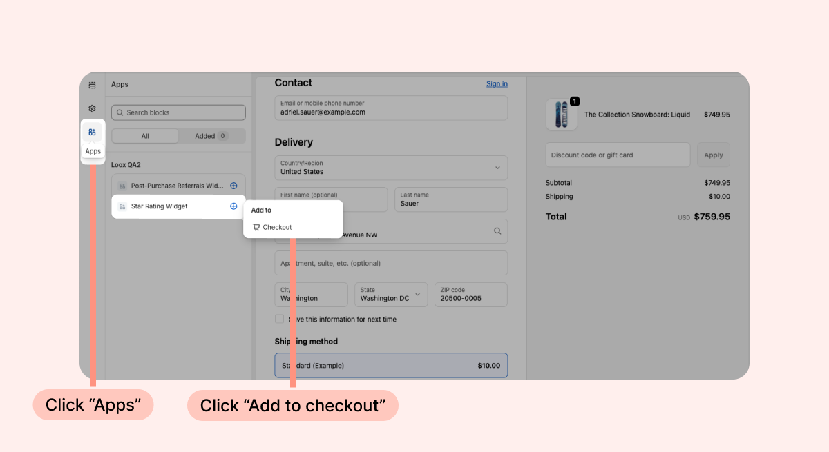 You can add the Star Rating Widget directly from your Loox admin or from the Shopify checkout editor. To add it from your Loox admin: